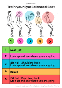 A visual guide helping young riders train their eye by observing peers, spotting posture patterns, and giving clear, supportive feedback like an instructor.